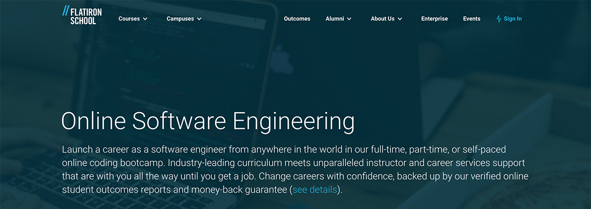 With over 7,000 alumni and grad placements at top companies, Hack Reactor comes highly recommended within the industry. They focus on one thing and they do it well: JavaScript. The program exists through a live, virtual classroom, offering pair programming and an on-demand help desk over video conference. Hack Reactor prides itself on providing “the most refined, up-to-date curriculum.”
