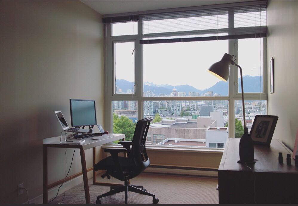 We moved to a new apartment a few months ago. I used to work from a little nook in the living room and now I have my own office! I kept it very simple, with just a desk and a comfortable chair. I have a monitor and a trackpad. I do have the most amazing view of the mountains that people love to see when they chat with me.